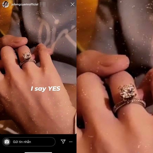 Hình ảnh trên ngay lập tức khiến nhiều người bất ngờ. Cư dân mạng phỏng đoán có thể Jolie Nguyễn vừa gật đầu với lời cầu hôn bằng nhẫn kim cương "khủng".