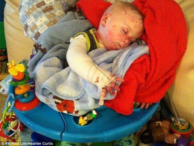 Vết thương nhìn qua trông giống như những vết bỏng độ ba. Các bác sĩ gần như có thể nhìn thấy được não bộ qua lớp da đầu mỏng của bé.