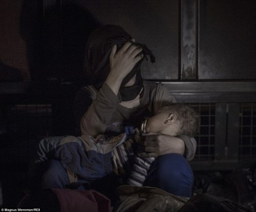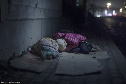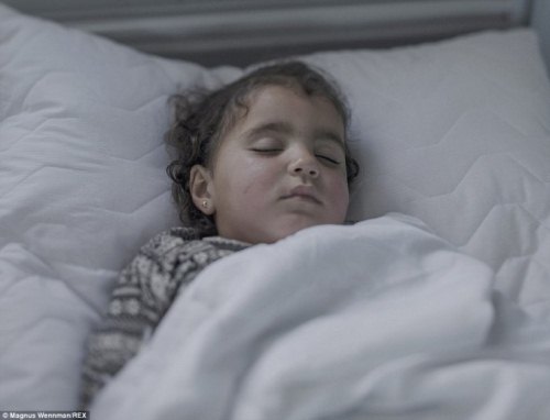 Abdullah, 5 tuổi, ngủ trên một tấm nệm bẩn thỉu bên ngoài nhà ga ở Belgrade. Em bị mắc căn bệnh về máu nhưng mẹ em không có tiền để chữa trị cho em. Hàng ngày, mỗi khi ngủ em vẫn gặp phải những cơn ác mộng sau khi chứng kiến cảnh em gái mình bị sát hại ngay tại nhà ở Daraa, Syria. |