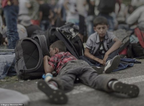 Bé Ahmad, 7 tuổi, ngủ gục trên vỉa hè ở biên giới của Hungary - Áo. Khi ngôi nhà của bé ở Idlib bị bom tàn phá, em trai của Ahmad đã thiệt mạng, chỉ có bé cùng với cha mẹ may mắn thoát thân. Cả gia đình bé phải lên đường tìm một cuộc sống khác với bao khó khăn, vất vả trước mắt. |