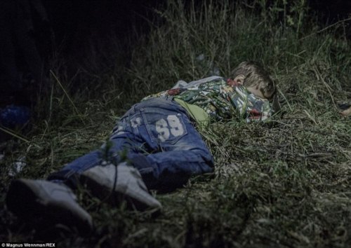 Ahmed, 6 tuổi, ngủ trên bãi cỏ ở Horgos, Serbia. Ahmed di cư cùng với chú của mình sau khi cha bị chết ngay tại quê hương Deir ez-Zor, miền bắc Syria. |