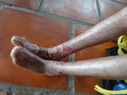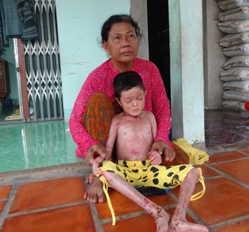 Còn bé Nghi, bây giờ đã 11 tuổi nhưng cân nặng chừng chục kg, toàn thân em nổi đầy bóng nước, có chỗ lở loét sâu vào trong từng thớ thịt. Các bong bóng nước bể ra, da bong tróc lên. Cứ độ 2 tháng là da trên khắp cơ thể bé Nghi bong tróc dữ dội, rồi lột thành từng lớp cứ như con rắn lột da. Hễ bắt đầu “chu kỳ” lột da là Nghi phát sốt, ăn, ngủ không được do đau nhức.