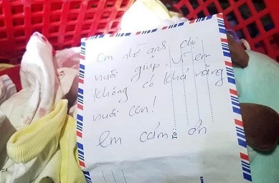 Đi chơi về, người đàn ông phát hiện bé gái khoảng 2 tháng tuổi được đặt trong chiếc làn để ở trước ngõ, bên trong có đồ dùng của bé cùng vài dòng chữ viết vội trên vỏ phong bì.