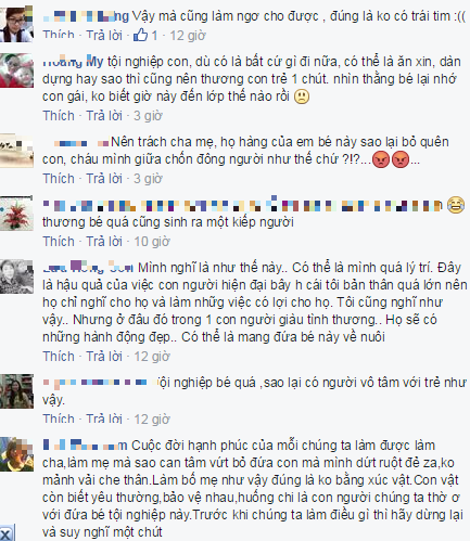 Facebooker Huong Ho thì cho rằng: “Nên trách cha mẹ, họ hàng của em bé này sao lại bỏ quên con, cháu mình giữa chốn đông người như thế chứ?”.
