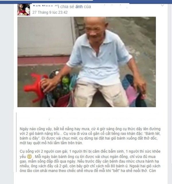 Trên facebook của mình, A.N viết: "Ngày nào cũng vậy, bất kể nắng hay mưa, cứ 4 giờ sáng, ông cụ thức dậy lên đường với 2 giỏ bánh nặng trĩu... Cụ vừa đi vừa cố gân cổ cất tiếng rao khàn đặc: “Bánh tét, bánh ú đây”. Đi được vài chục mét, cụ dừng lại đặt hai giỏ bánh xuống đất thở dốc, một tay quệt mồ hôi lấm tấm trên trán.