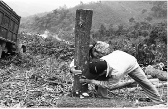 Cánh rừng họ đang khai thác keo này rộng khoảng 3ha, trên một đồi nhỏ, những cây keo được chặt hạ trải từ triền đồi lên tới đỉnh. Mỗi ngày với một “đội” 6 người sẽ bốc được từ 8 đến 10 tấn keo lên xe cơ giới để vận chuyển ra tới đường.
