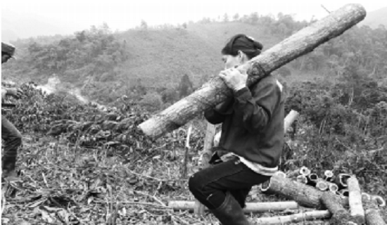 Dù trên vai vác những khúc gỗ keo nặng hàng chục kg, nhưng nữ "phu keo" vẫn thoăn thoắt bước đi. |