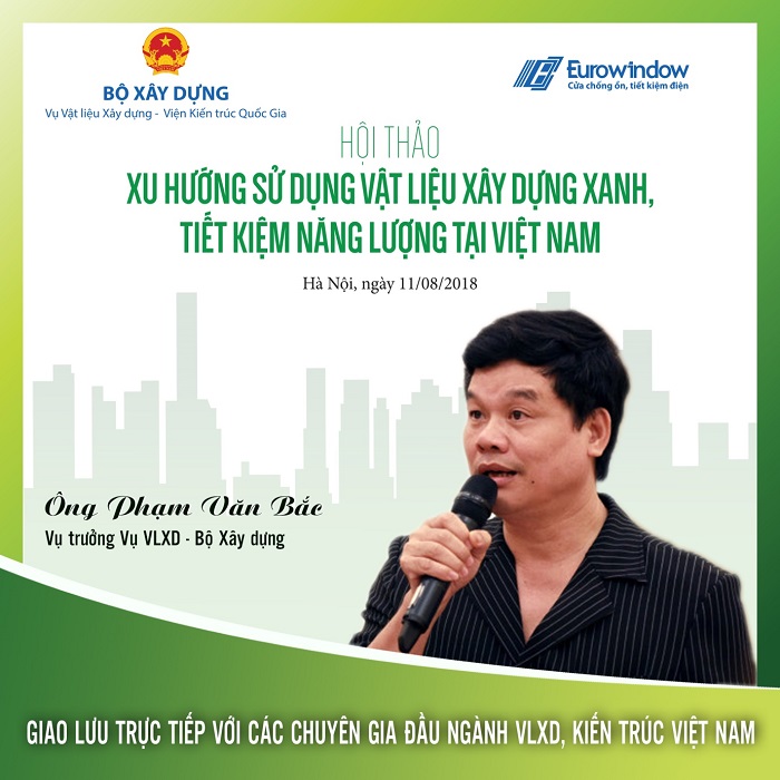 | Vụ trưởng Vụ VLXD (Bộ Xây dựng) - Phạm Văn Bắc sẽ tham dự hội thảo “Xu hướng sử dụng vật liệu xây dựng xanh, tiết kiệm năng lượng tại Việt Nam” ngày 11/08 để giao lưu trực tiếp với các chuyên gia đầu ngành về xu hướng sử dụng vật liệu xanh cho công trình. |