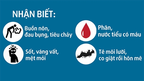 Khi bị ngộ độc thực phẩm cơ thể thường xuất hiện các triệu chứng đau bụng quằn quại, đi ngoài phân lỏng nhiều lần trong ngày, đau đầu, choáng váng, buồn nôn hoặc nôn mửa liên tục, sốt nóng hoặc sốt rét, khó thở, da tím tái, vã mồ hôi, truỵ mạch (mạch nhanh, huyết áp tụt), co giật...