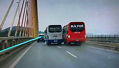 Hai xe khách chèn ép, lạng lách trên cầu Bãi Cháy (Ảnh: báo Công an nhân dân) |