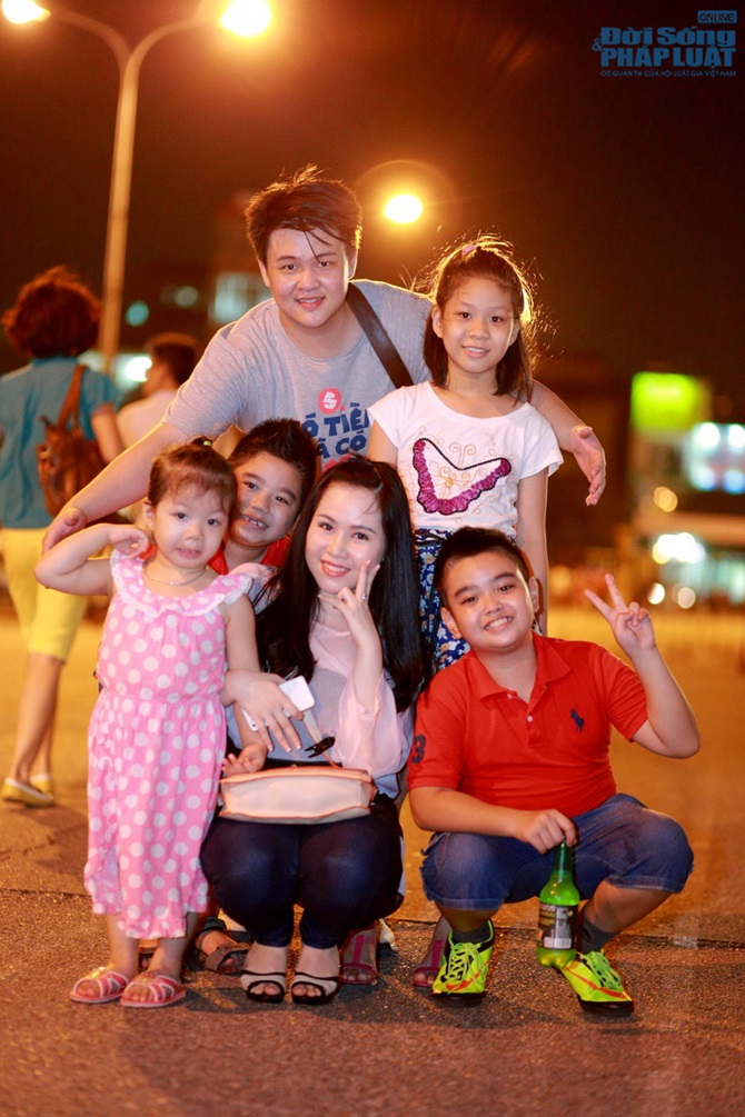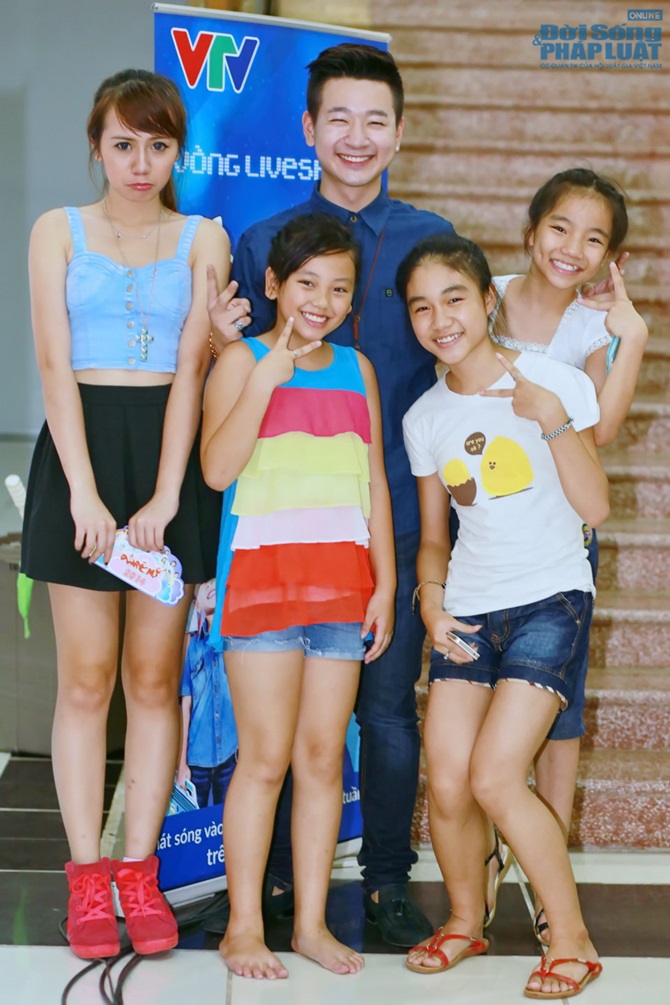 | Huyền My - cô ca sĩ xinh đẹp của Sao Mai điểm hẹn 2014 nhí nhảnh chụp hình cùng Thanh Tùng và 3 em nhỏ. |
