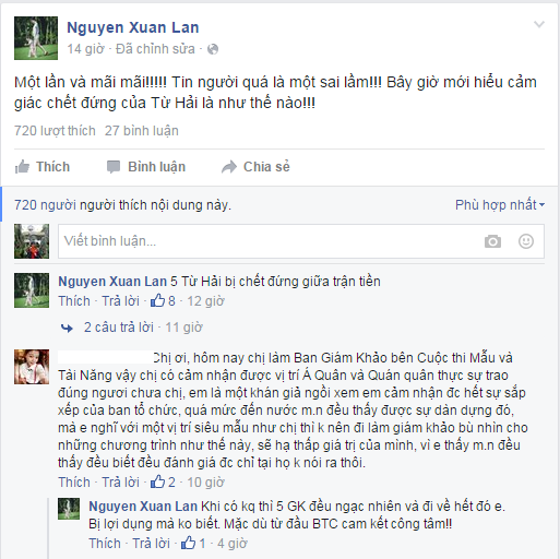 “Nếu biết trước thì sẽ không bao giờ nhận em à. Chỉ thương các bạn thí sinh hoang mang và mất niềm tin. BGK thì hì hục ngồi chấm. Xong kết quả bị tráo một cách trơ trẽn!!”, siêu mẫu Xuân Lan chia sẻ.