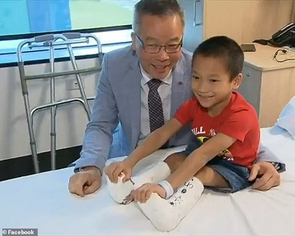 Bé Chiến và bác sĩ điều trị cho em, ông Tom Tran - Ảnh: Daily Mail |