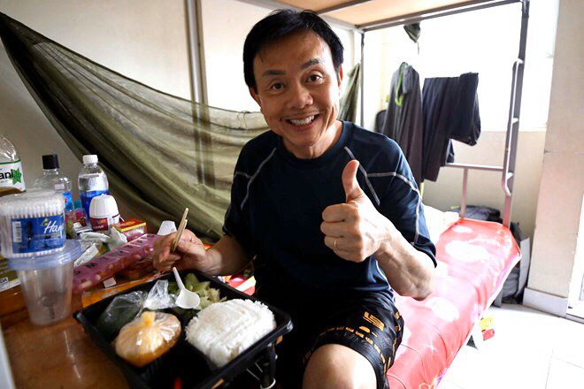 Nghệ sĩ Chí Tài và các du học sinh tại khu cách ly tập trung. Ảnh: Thanh Niên |
