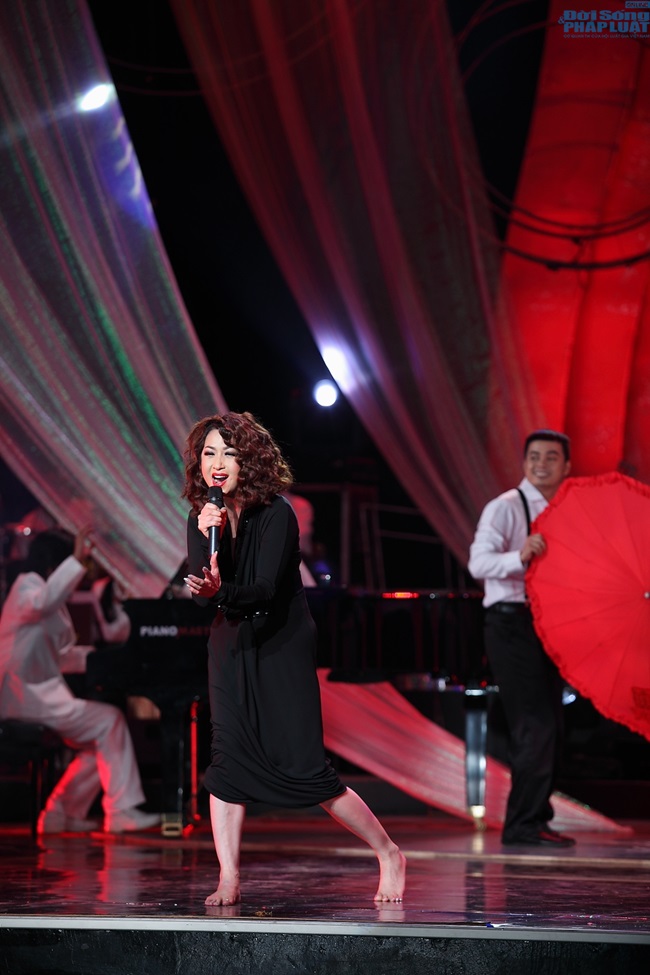 | Ý Lan làm cho bầu không khí của nhà hát sôi động hơn khi chị chân trần trình diễn Liên khúc nhạc Pháp. |