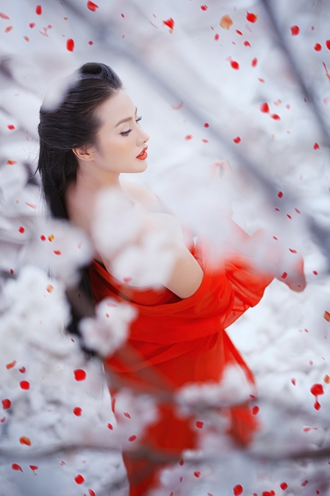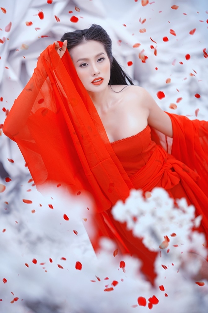 (ĐSPL) - Chọn trang phục dỏ trong nền tuyết trắng xóa. Trương Nhi lột tả trọn vẹn khí chất lạnh lùng, băng giá của Lý Mạc Sầu qua biểu cảm gương mặt sắc lạnh cùng ánh mắt đượm buồn, ẩn chứa nhiều tâm sự.