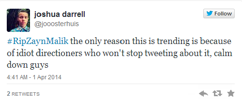Chỉ vài giờ trước ngày Cá tháng tư (1/4) diễn ra, thành viên được mệnh danh điển trai nhất nhóm One Direction-Zayn Malik đã trở thành nạn nhân xấu số của trò đùa "dại" này. Anh bị tung tin là đã qua đời và tin tức này đã lan tràn trên các mạng xã hội một cách nhanh chóng. Một nickname có tên “#Ripzaynmalik” (thương tiếc Zayn Malik) được lập nên và nhận được lượng theo dõi lớn từ các fan hâm mộ của nhóm nhạc đình đám này.
